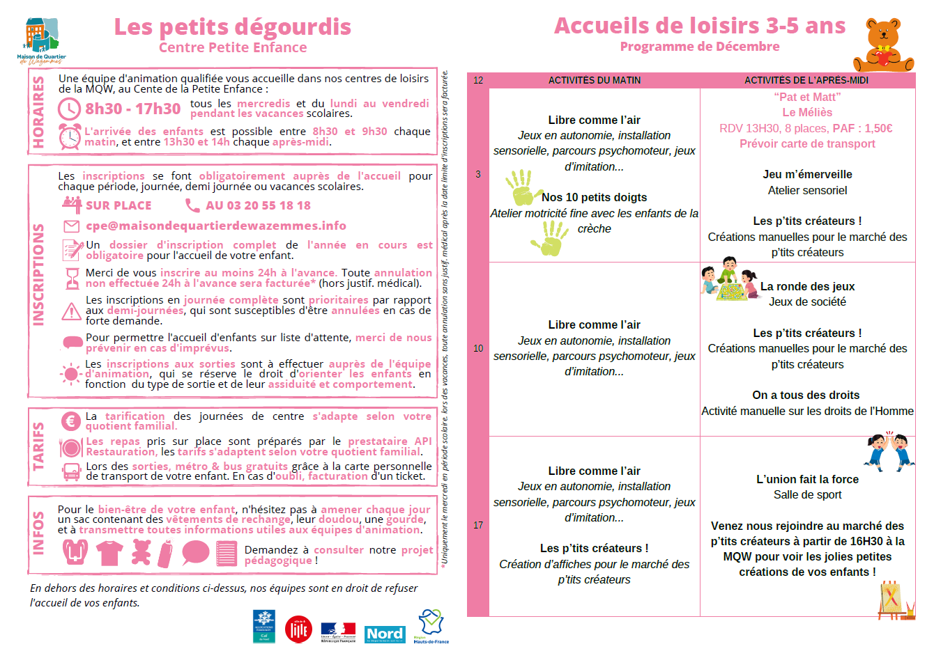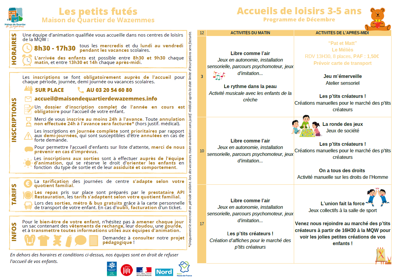 Pour plus de renseignements, rendez-vous à l’accueil de la MQW, au 03 20 54 60 80 ou par e-mail : accueil@maisondequartierdewazemmes.info