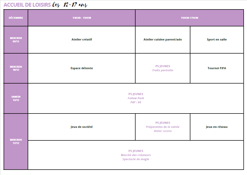Le programme des vacances sera envoyé aux familles inscrites avant le 19 décembre.